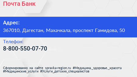 Почта Банк по адресу 367010, Дагестан, Махачкала, проспект Гамидова, 50 в дальнейшем Организация, размещена в следующих категориях: