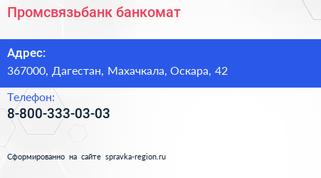 Промсвязьбанк, банкомат по адресу 367000, Дагестан, Махачкала, Оскара, 42 в дальнейшем Организация, размещена в следующих категориях: