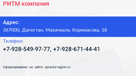 РИТМ, компания по адресу 367000, Дагестан, Махачкала, Коркмасова, 18 в дальнейшем Организация, размещена в следующих категориях: