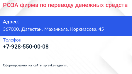 РОЗА, фирма по переводу денежных средств по адресу 367000, Дагестан, Махачкала, Коркмасова, 45 в дальнейшем Организация, размещена в следующих категориях: