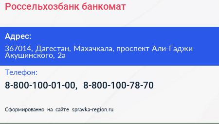 Россельхозбанк, банкомат по адресу 367014, Дагестан, Махачкала, проспект Али-Гаджи Акушинского, 2а в дальнейшем Организация, размещена в следующих категориях:
