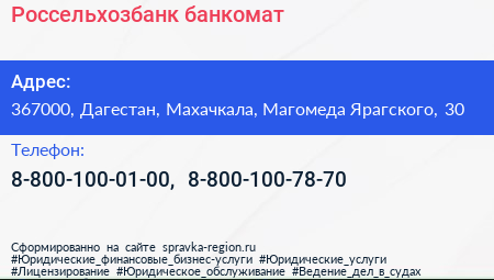Россельхозбанк, банкомат по адресу 367000, Дагестан, Махачкала, Магомеда Ярагского, 30 в дальнейшем Организация, размещена в следующих категориях: