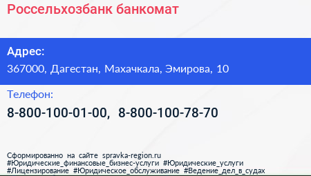 Россельхозбанк, банкомат по адресу 367000, Дагестан, Махачкала, Эмирова, 10 в дальнейшем Организация, размещена в следующих категориях: