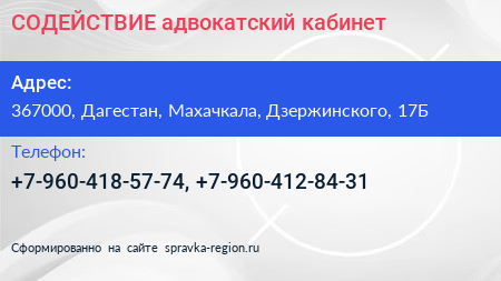 СОДЕЙСТВИЕ, адвокатский кабинет по адресу 367000, Дагестан, Махачкала, Дзержинского, 17Б в дальнейшем Организация, размещена в следующих категориях: