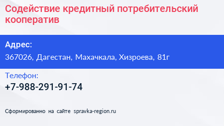 Содействие, кредитный потребительский кооператив по адресу 367026, Дагестан, Махачкала, Хизроева, 81г в дальнейшем Организация, размещена в следующих категориях: