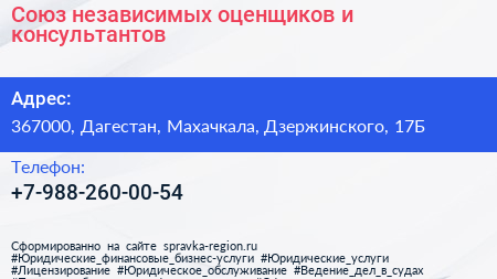 Союз независимых оценщиков и консультантов по адресу 367000, Дагестан, Махачкала, Дзержинского, 17Б в дальнейшем Организация, размещена в следующих категориях: