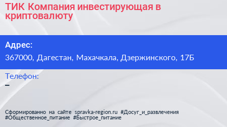 ТИК, Компания инвестирующая в криптовалюту по адресу 367000, Дагестан, Махачкала, Дзержинского, 17Б в дальнейшем Организация, размещена в следующих категориях: