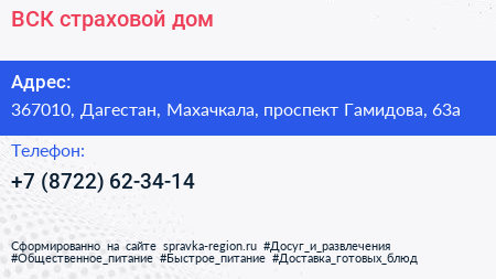 ВСК, страховой дом по адресу 367010, Дагестан, Махачкала, проспект Гамидова, 63а в дальнейшем Организация, размещена в следующих категориях: