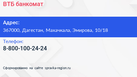 ВТБ, банкомат по адресу 367000, Дагестан, Махачкала, Эмирова, 10/18 в дальнейшем Организация, размещена в следующих категориях: