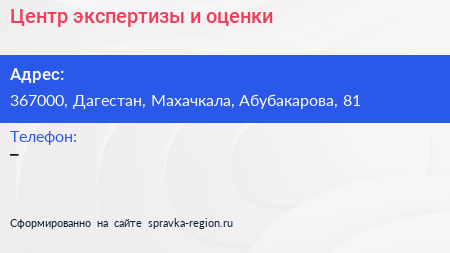 Центр экспертизы и оценки по адресу 367000, Дагестан, Махачкала, Абубакарова, 81 в дальнейшем Организация, размещена в следующих категориях: