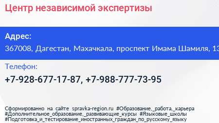 Центр независимой экспертизы по адресу 367008, Дагестан, Махачкала, проспект Имама Шамиля, 13 в дальнейшем Организация, размещена в следующих категориях: