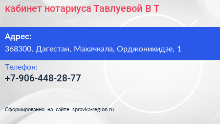 кабинет нотариуса Тавлуевой В.Т. по адресу 368300, Дагестан, Махачкала, Орджоникидзе, 1 в дальнейшем Организация, размещена в следующих категориях: