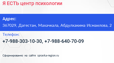 Я ЕСТЬ, центр психологии по адресу 367029, Дагестан, Махачкала, Абдулхакима Исмаилова, 2 в дальнейшем Организация, размещена в следующих категориях: