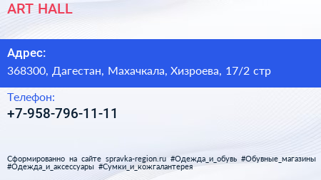 ART HALL по адресу 368300, Дагестан, Махачкала, Хизроева, 17/2 стр в дальнейшем Организация, размещена в следующих категориях: