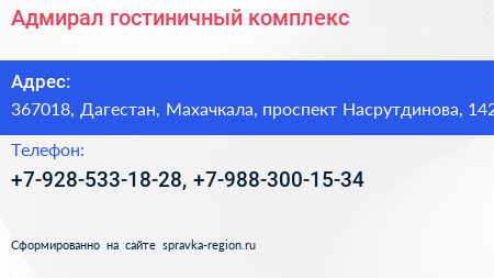 Адмирал, гостиничный комплекс по адресу 367018, Дагестан, Махачкала, проспект Насрутдинова, 142 в дальнейшем Организация, размещена в следующих категориях: