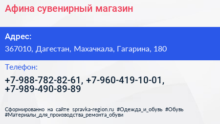 Афина, сувенирный магазин по адресу 367010, Дагестан, Махачкала, Гагарина, 180 в дальнейшем Организация, размещена в следующих категориях: