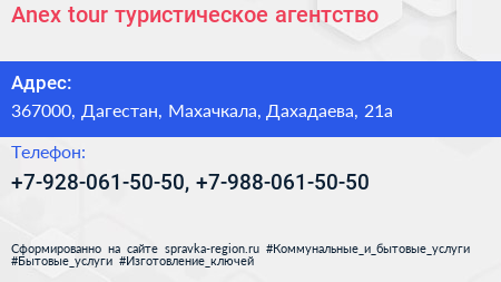 Anex tour, туристическое агентство по адресу 367000, Дагестан, Махачкала, Дахадаева, 21а в дальнейшем Организация, размещена в следующих категориях:
