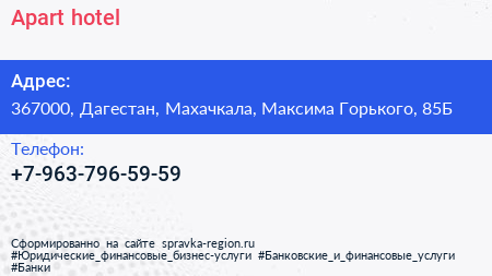 Apart-hotel по адресу 367000, Дагестан, Махачкала, Максима Горького, 85Б в дальнейшем Организация, размещена в следующих категориях: