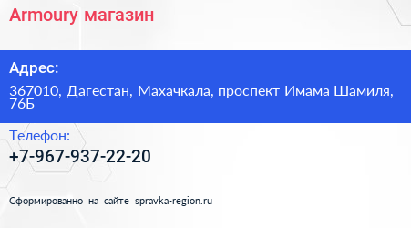 Armoury, магазин по адресу 367010, Дагестан, Махачкала, проспект Имама Шамиля, 76Б в дальнейшем Организация, размещена в следующих категориях: