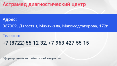 Астрамед, диагностический центр по адресу 367009, Дагестан, Махачкала, Магомедтагирова, 172г в дальнейшем Организация, размещена в следующих категориях: