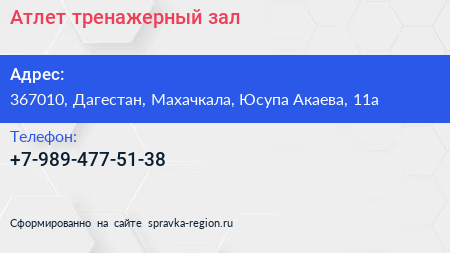Атлет, тренажерный зал по адресу 367010, Дагестан, Махачкала, Юсупа Акаева, 11а в дальнейшем Организация, размещена в следующих категориях: