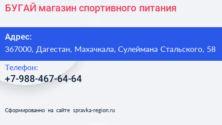 БУГАЙ, магазин спортивного питания по адресу 367000, Дагестан, Махачкала, Сулеймана Стальского, 58 в дальнейшем Организация, размещена в следующих категориях: