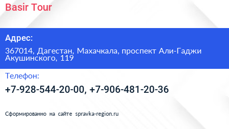 Basir Tour по адресу 367014, Дагестан, Махачкала, проспект Али-Гаджи Акушинского, 119 в дальнейшем Организация, размещена в следующих категориях: