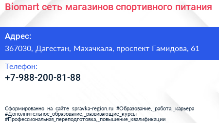 Biomart, сеть магазинов спортивного питания по адресу 367030, Дагестан, Махачкала, проспект Гамидова, 61 в дальнейшем Организация, размещена в следующих категориях: