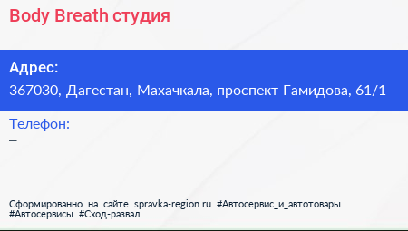 Body Breath, студия по адресу 367030, Дагестан, Махачкала, проспект Гамидова, 61/1 в дальнейшем Организация, размещена в следующих категориях: