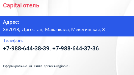 Capital, отель по адресу 367018, Дагестан, Махачкала, Мекегинская, 3 в дальнейшем Организация, размещена в следующих категориях: