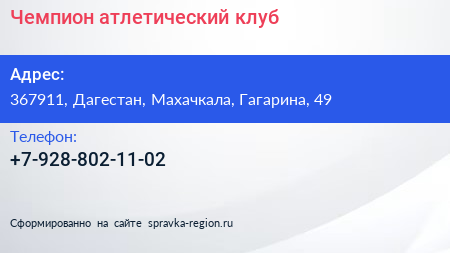 Чемпион, атлетический клуб по адресу 367911, Дагестан, Махачкала, Гагарина, 49 в дальнейшем Организация, размещена в следующих категориях: