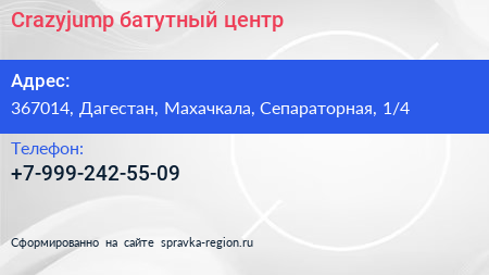 Crazyjump, батутный центр по адресу 367014, Дагестан, Махачкала, Сепараторная, 1/4 в дальнейшем Организация, размещена в следующих категориях: