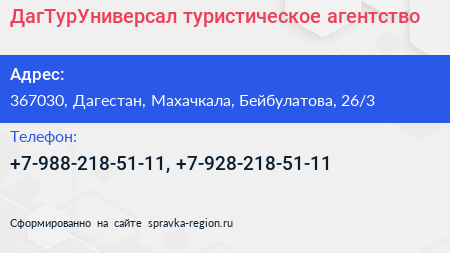 ДагТурУниверсал, туристическое агентство по адресу 367030, Дагестан, Махачкала, Бейбулатова, 26/3 в дальнейшем Организация, размещена в следующих категориях: