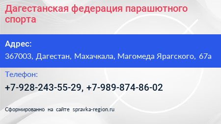 Дагестанская федерация парашютного спорта по адресу 367003, Дагестан, Махачкала, Магомеда Ярагского, 67а в дальнейшем Организация, размещена в следующих категориях: