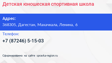 Детская юношеская спортивная школа по адресу 368305, Дагестан, Махачкала, Ленина, 6 в дальнейшем Организация, размещена в следующих категориях: