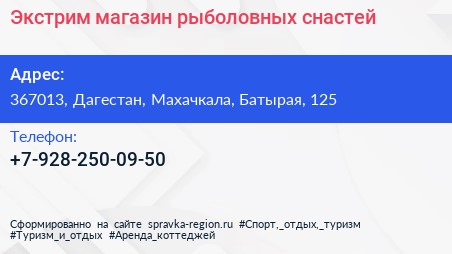 Экстрим, магазин рыболовных снастей по адресу 367013, Дагестан, Махачкала, Батырая, 125 в дальнейшем Организация, размещена в следующих категориях: