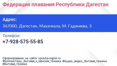Федерация плавания Республики Дагестан по адресу 367000, Дагестан, Махачкала, М. Гаджиева, 3 в дальнейшем Организация, размещена в следующих категориях: