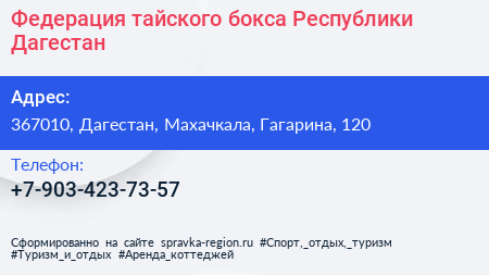 Федерация тайского бокса Республики Дагестан по адресу 367010, Дагестан, Махачкала, Гагарина, 120 в дальнейшем Организация, размещена в следующих категориях: