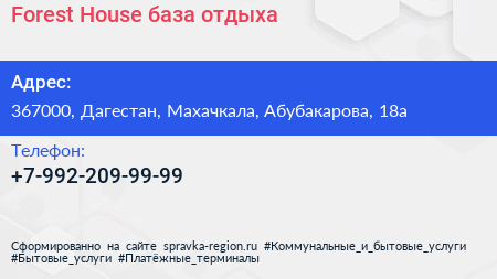 Forest House, база отдыха по адресу 367000, Дагестан, Махачкала, Абубакарова, 18а в дальнейшем Организация, размещена в следующих категориях: