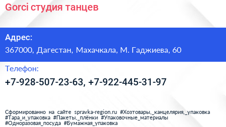 Gorci, студия танцев по адресу 367000, Дагестан, Махачкала, М. Гаджиева, 60 в дальнейшем Организация, размещена в следующих категориях: