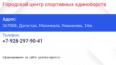 Городской центр спортивных единоборств по адресу 367008, Дагестан, Махачкала, Умаханова, 14ж в дальнейшем Организация, размещена в следующих категориях: