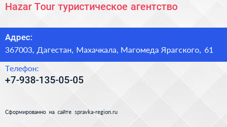 Hazar Tour, туристическое агентство по адресу 367003, Дагестан, Махачкала, Магомеда Ярагского, 61 в дальнейшем Организация, размещена в следующих категориях:
