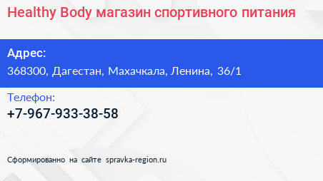 Healthy Body, магазин спортивного питания по адресу 368300, Дагестан, Махачкала, Ленина, 36/1 в дальнейшем Организация, размещена в следующих категориях: