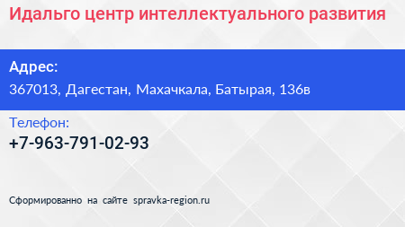 Идальго, центр интеллектуального развития по адресу 367013, Дагестан, Махачкала, Батырая, 136в в дальнейшем Организация, размещена в следующих категориях: