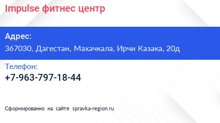 Impulse, фитнес-центр по адресу 367030, Дагестан, Махачкала, Ирчи Казака, 20д в дальнейшем Организация, размещена в следующих категориях: