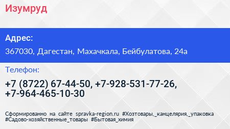 Изумруд по адресу 367030, Дагестан, Махачкала, Бейбулатова, 24а в дальнейшем Организация, размещена в следующих категориях: