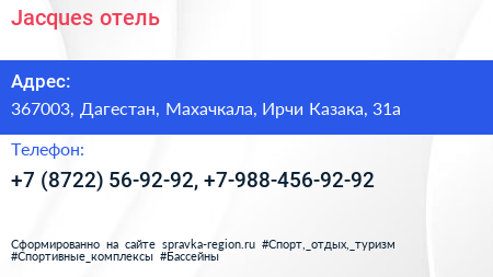 Jacques, отель по адресу 367003, Дагестан, Махачкала, Ирчи Казака, 31а в дальнейшем Организация, размещена в следующих категориях: