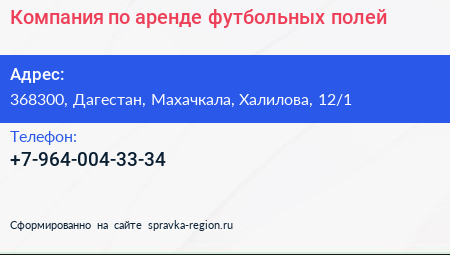Компания по аренде футбольных полей по адресу 368300, Дагестан, Махачкала, Халилова, 12/1 в дальнейшем Организация, размещена в следующих категориях: