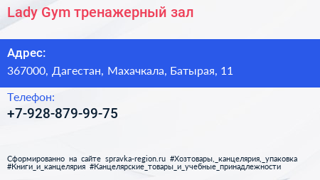 Lady Gym, тренажерный зал по адресу 367000, Дагестан, Махачкала, Батырая, 11 в дальнейшем Организация, размещена в следующих категориях: