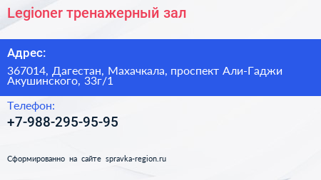 Legioner, тренажерный зал по адресу 367014, Дагестан, Махачкала, проспект Али-Гаджи Акушинского, 33г/1 в дальнейшем Организация, размещена в следующих категориях: